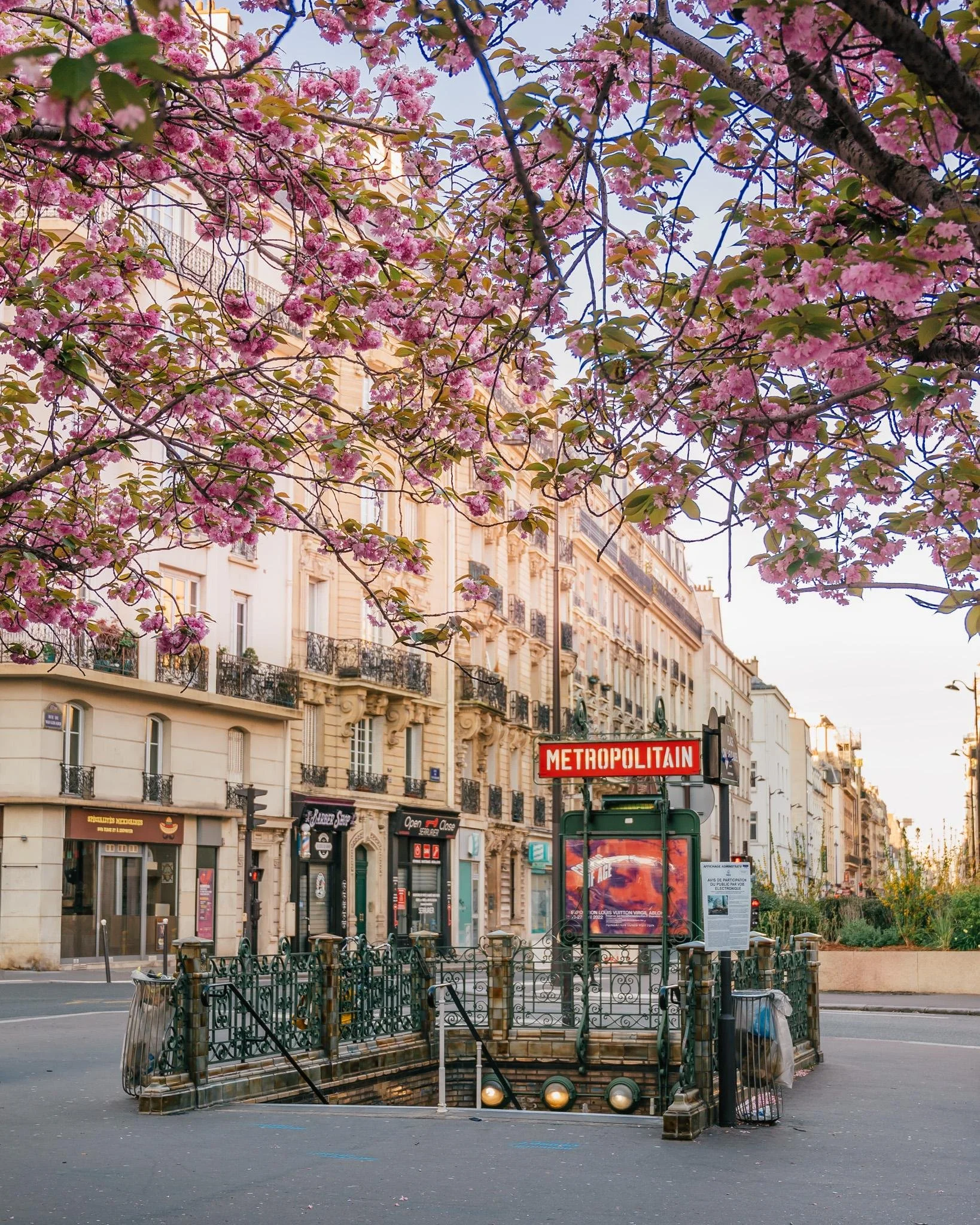 There are a couple of bright pink cherry blossom trees framing the staircase, which you can also use to photograph the metro sign and beautiful building in the background.