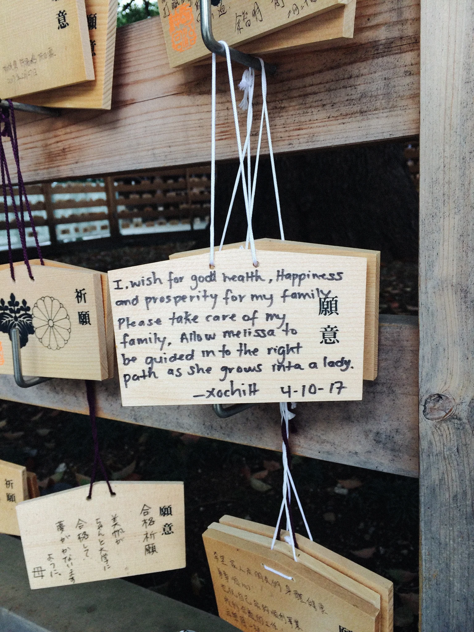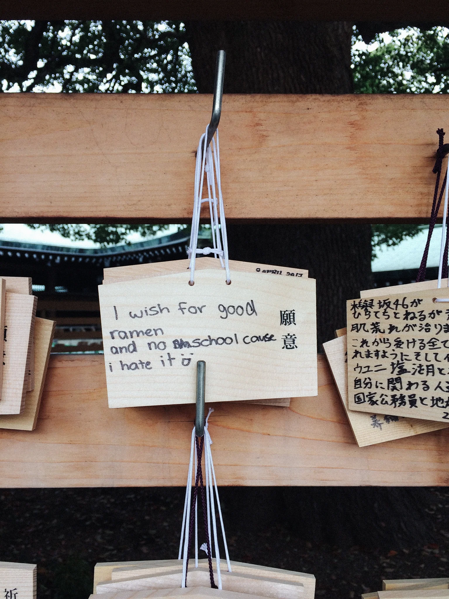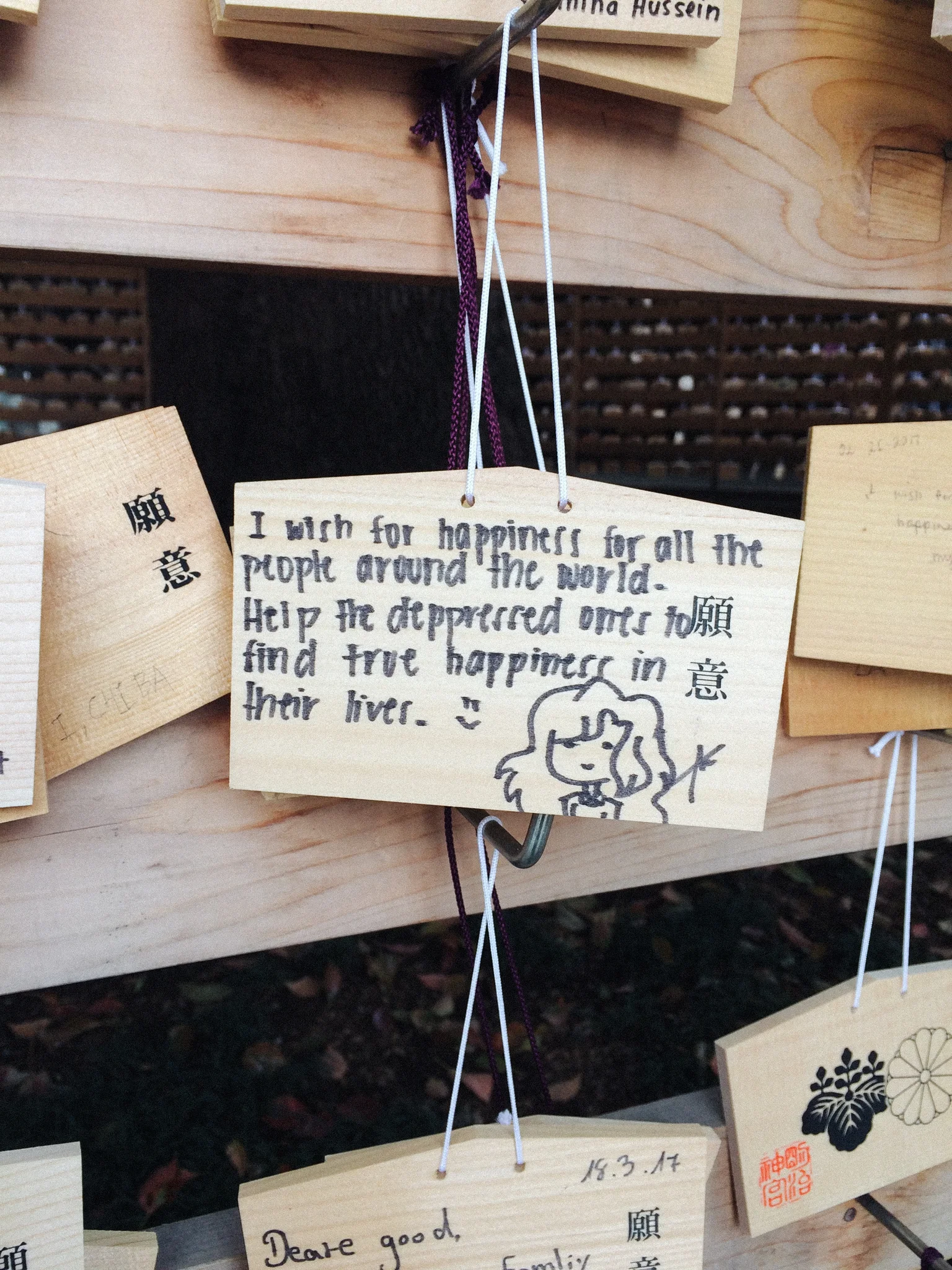 When we were in Japan, whenever we visited a shrine we'd see these rows of 'Ema' (絵馬) wooden wishing plaques. There were usually animals on one side and wishes written on the other side.