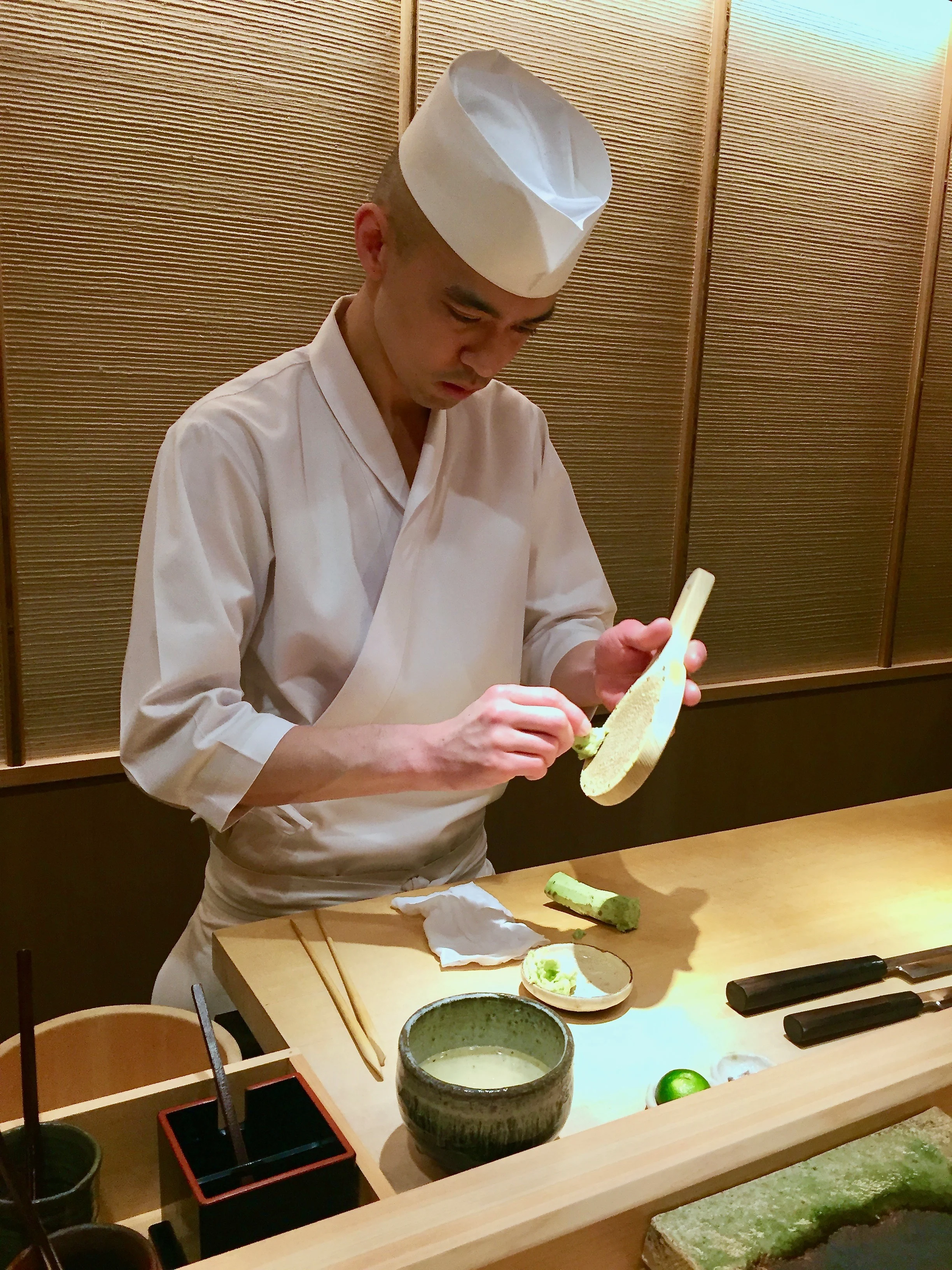 The dining room fits max 6 people, as it's meant to be an intimate experience between you and the sushi chef. The moment you walk in, you notice how clean and simple the room is. The lighting is set in a way to highlight the sushi and the sushi chef. For the next two and a half hours, the six of us watched this sushi master at work. Most of the time we were all just silent, completely taken aback at how careful and intentional this chef was treating every piece of sushi. It was almost like we were watching an intricate ballet performance, except you were kind of part of it because you got to eat the creations in real time.
