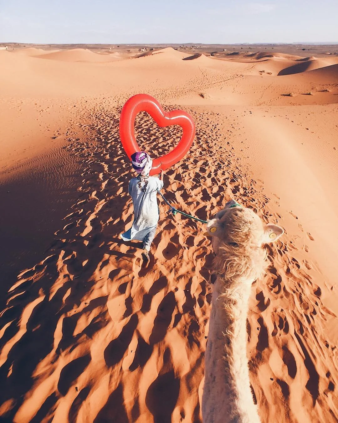 You can choose to stay in Erfoud, which is a town right on the outskirts of the Sahara Desert, and then take a 4x4 into the Sahara, ending with a sunset camel ride into the dunes. We did this option with La Rose du Desert. Also, we used to carry an inflatable red heart around with us for pictures. The guy leading the camels insisted on carrying it - this is how it looked like from our view haha! (pictured below)