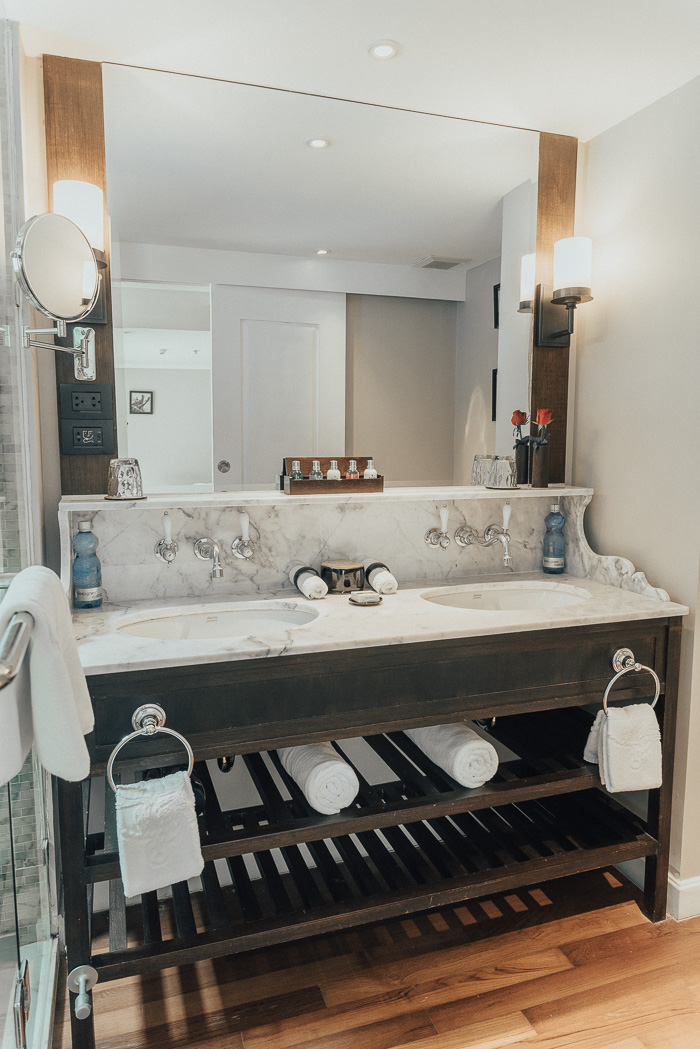 With design cues taken from the Strand Hotel in Yangon - the bathroom is beautifully appointed with teak wood and fine marble touches.
