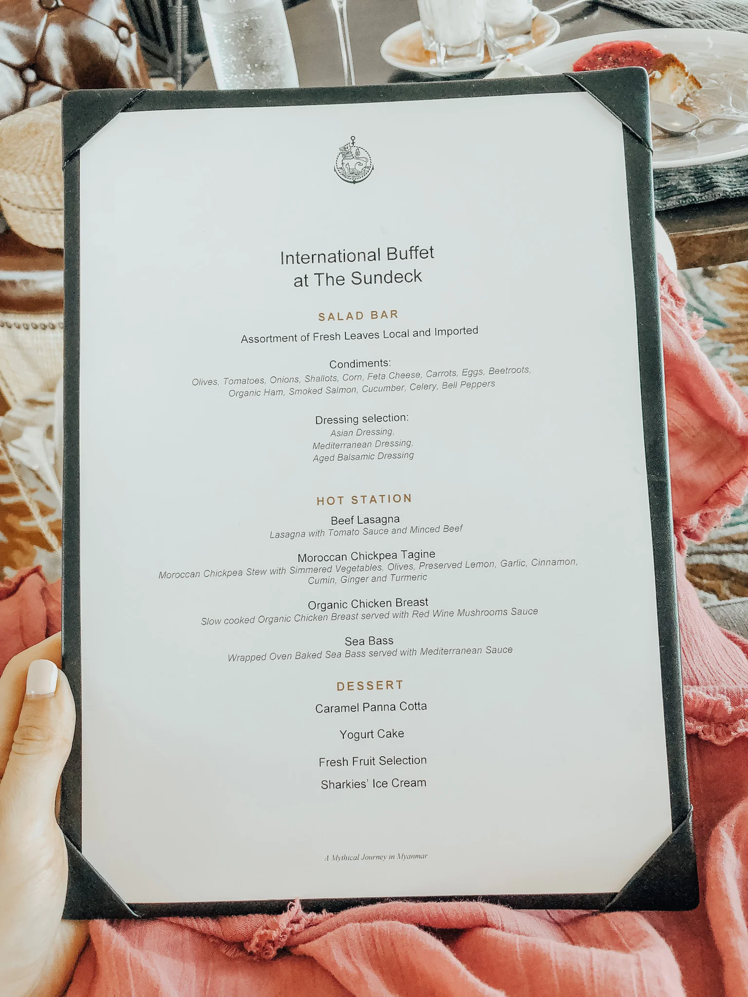 They have themes for each meal ranging from French, Burmese, Mediterranean, and Thai. I was pleasantly surprised to be having a decadent foie gras meal one night and then perfectly cooked Chilean Sea Bass the next.