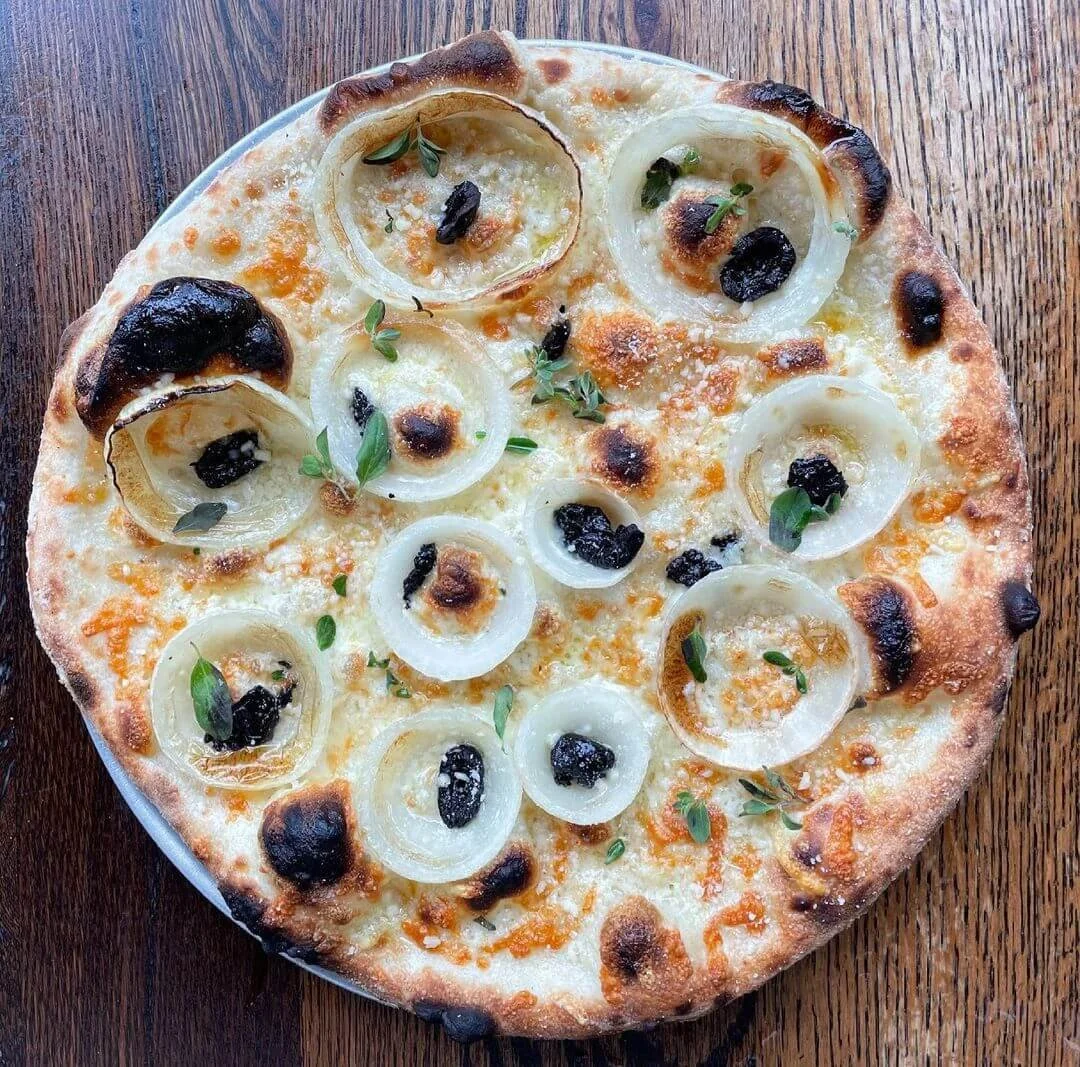 Some of our favorites are the Pesto (Tomato Sauce, Mozzarella, Ricotta, Garlic, Red Onion, House Pesto, Parmesan) and the White Pie (Mozzarella, Ricotta, Spinach, Garlic, Olive Oil, Parmesan).