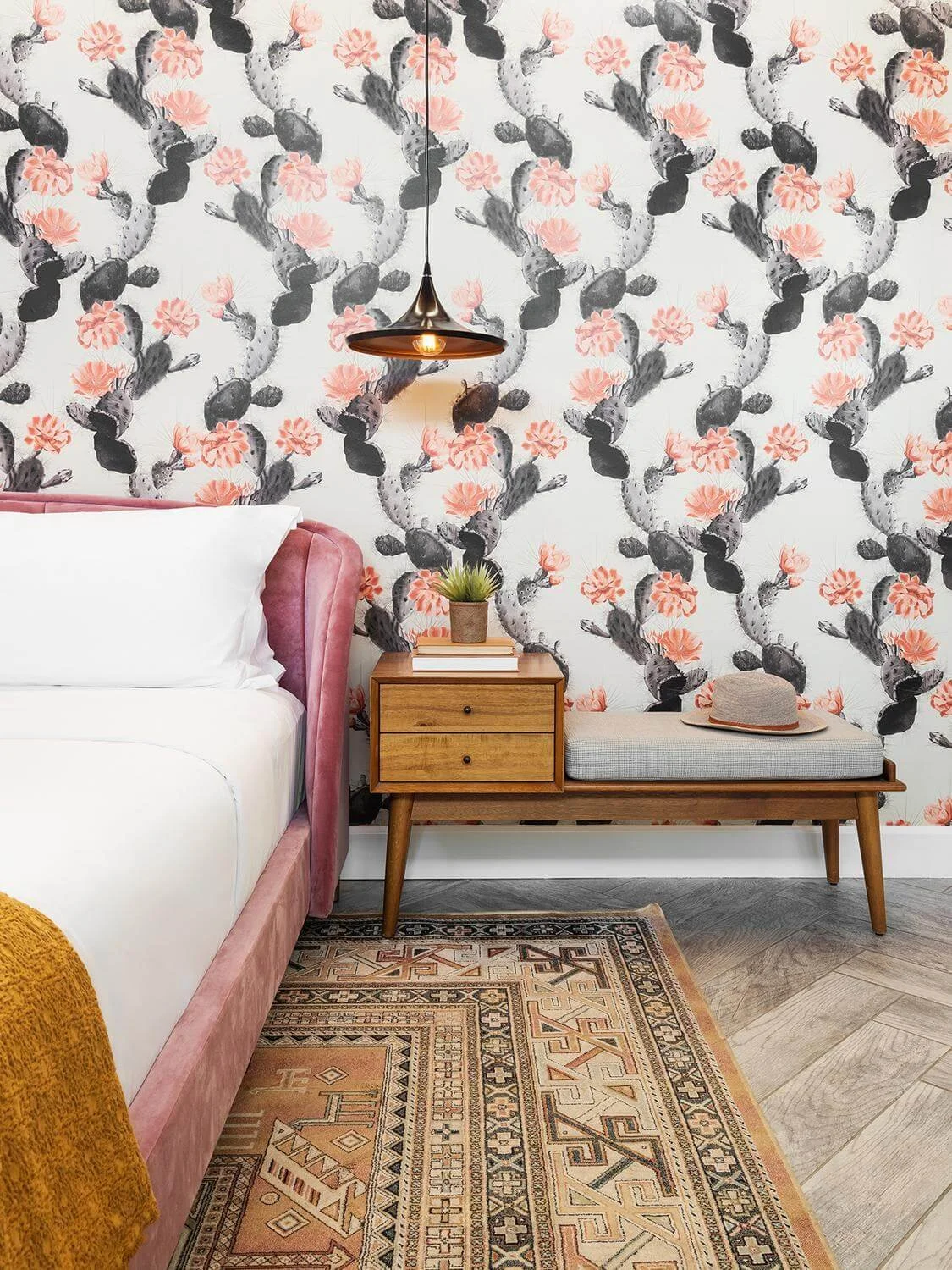 With interiors crafted by Jonathan Adler, the hallways fizzle with eye-catching carpets. In the rooms, the lamps come shaped in horse carousel splendor, the accent pillows are embroidered with palm trees, and a carefully curated mini-library of colorful paperbacks art books adorn each room.